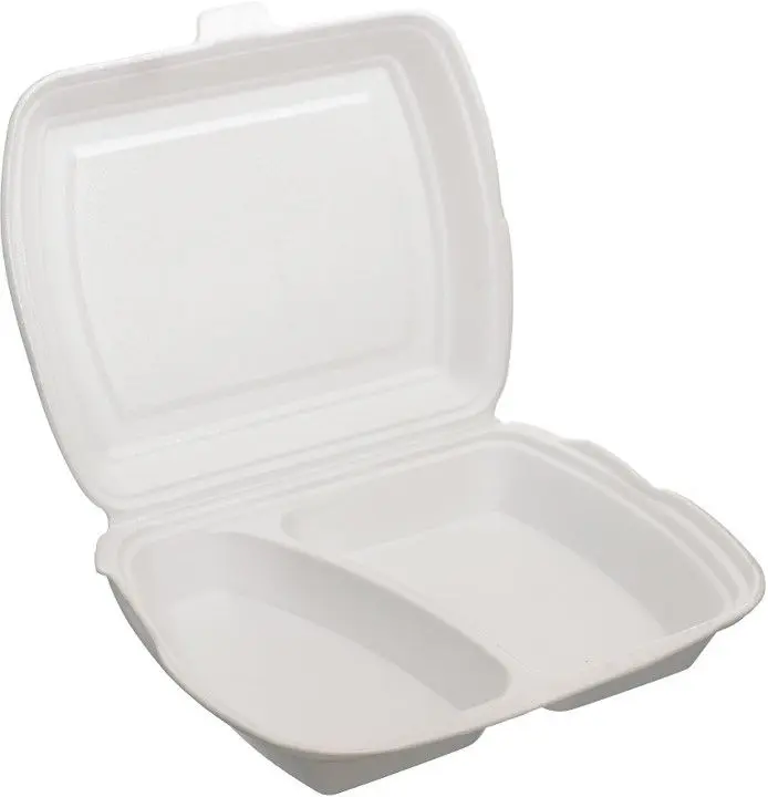 Одноразовый ланч-бокс с двумя секциями для упаковки готовой еды на вынос. Выполнен из вспененного полистирола, который хорошо сохраняет температуру и обеспечивает сохранность продуктов при транспортировке. Наличие отсеков позволит упаковать два разных блюда в один контейнер. Полностью отвечает гигиеническим нормам. Ланч-бокс можно использовать для разогрева продуктов в микроволновой печи.